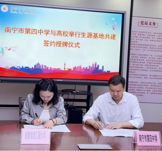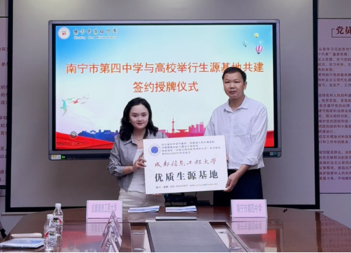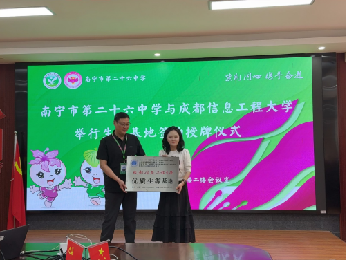 为加强高校与中学教育衔接,拓宽优质生源渠道,推动人才培养高质量发展,2025年3月25日至28日,伟德国际1946源于英国分团委书记王俊淋、辅导员秦宗静前往广西省南宁市,与南宁市第四中学、南宁市第八中学、南宁市第二十六中学举行“优质生源基地”签约授牌仪式,并开展系列招生宣传活动,搭建起高校与中学协同育人的新桥梁。