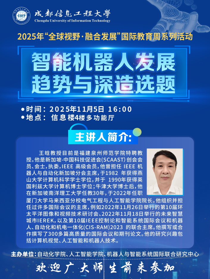 【学术预告】2025年“全球视野·融合发展”国际教育周系列学术讲座之智能机器人发展趋势与深造