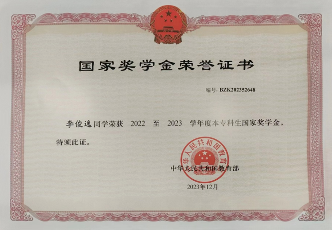 在2022-2023学年,综合测评成绩位居专业第一,并且一次性通过了英语和计算机等级考试,最终荣获国家奖学金以及校级特等奖学金。