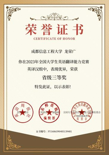 十年磨一剑,龙荣广同学在学习方面,大一大二连续两年综测专业第一,大三绩点专业第一,获得两次特等奖学金及一次国家奖学金。工作方面,担任部门负责人、学院团委副书记、社区兼职副书记,尽职尽责,收到表彰。实践方面,是疫情中的信息检录员,是挥洒青春汗水的大运会志愿者,是寻访红色踪迹的三下乡成员,是服务社会逐梦杨帆计划的参与者,目前累计志愿时长超百小时。此外,积极参与学科比赛,也有所收获。思想方面,积极向党组织靠拢,参与团课党课学习并顺利结业。课余中,运动放松,弹琴修身,积极参加各项活动,丰富自我。